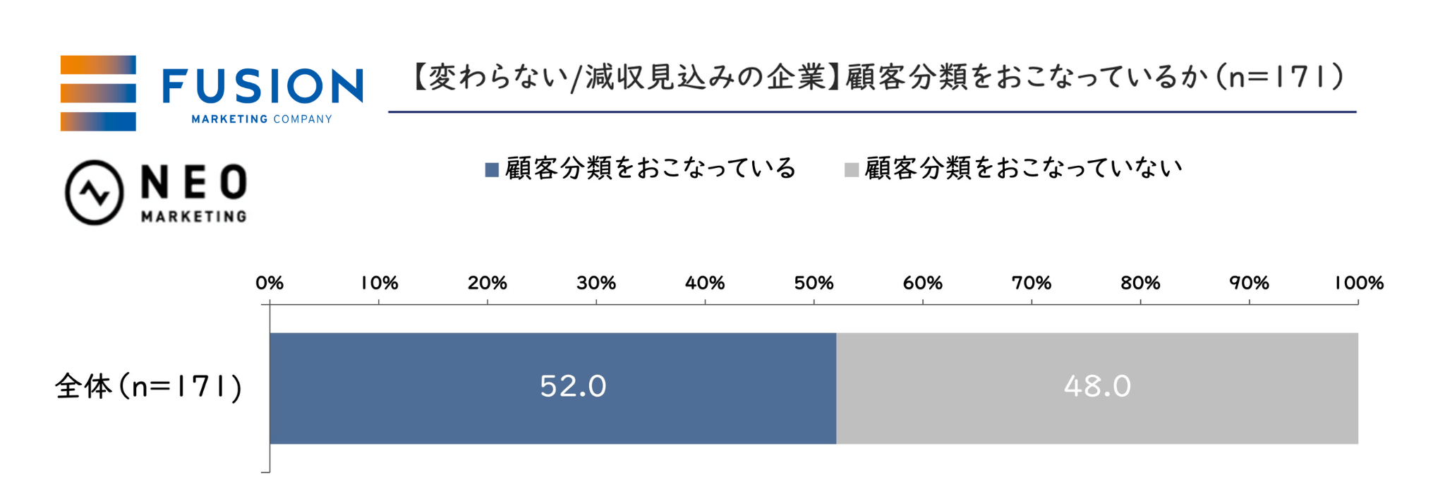 横ばい/減収企業の企業でも、約半数の52.0%が顧客分類をおこなっていましたが、両者の差はなんと31.7ポイント。