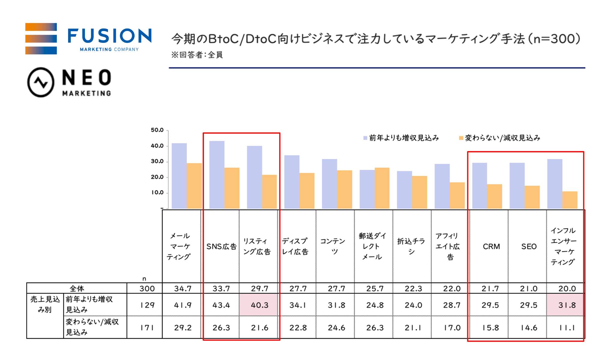 増収企業の場合、SNS広告やリスティング広告などといったWeb広告も約40%と、メールマーケティングと同等に注力しているようです。