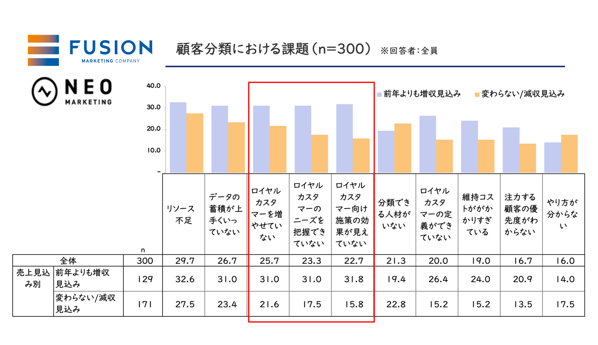 増収企業の場合、ロイヤルカスタマーが思うように増えていかなかったり、またそのせいでロイヤルカスタマーのニーズを正しく把握できているか不安が出てきたりといった、ロイヤルカスタマーを定義し施策を打った後の“結果”に関する課題が多くなっていました。