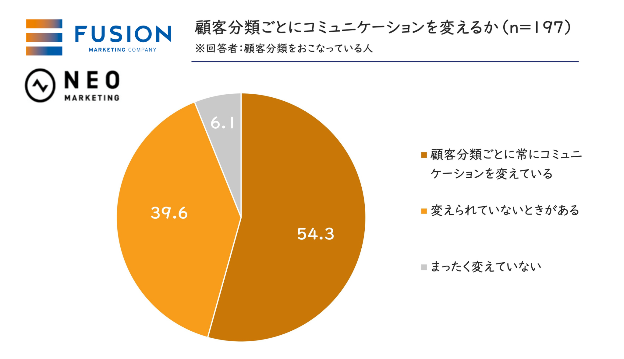 前掲した設問【自身が担当するビジネスで顧客分類をおこなっているか】では半数以上がおこなっていた顧客分類ですが、その先の「分類ごとに適したコミュニケーションを取る」という段階までは踏み込めていない企業がまだまだ多いようです。