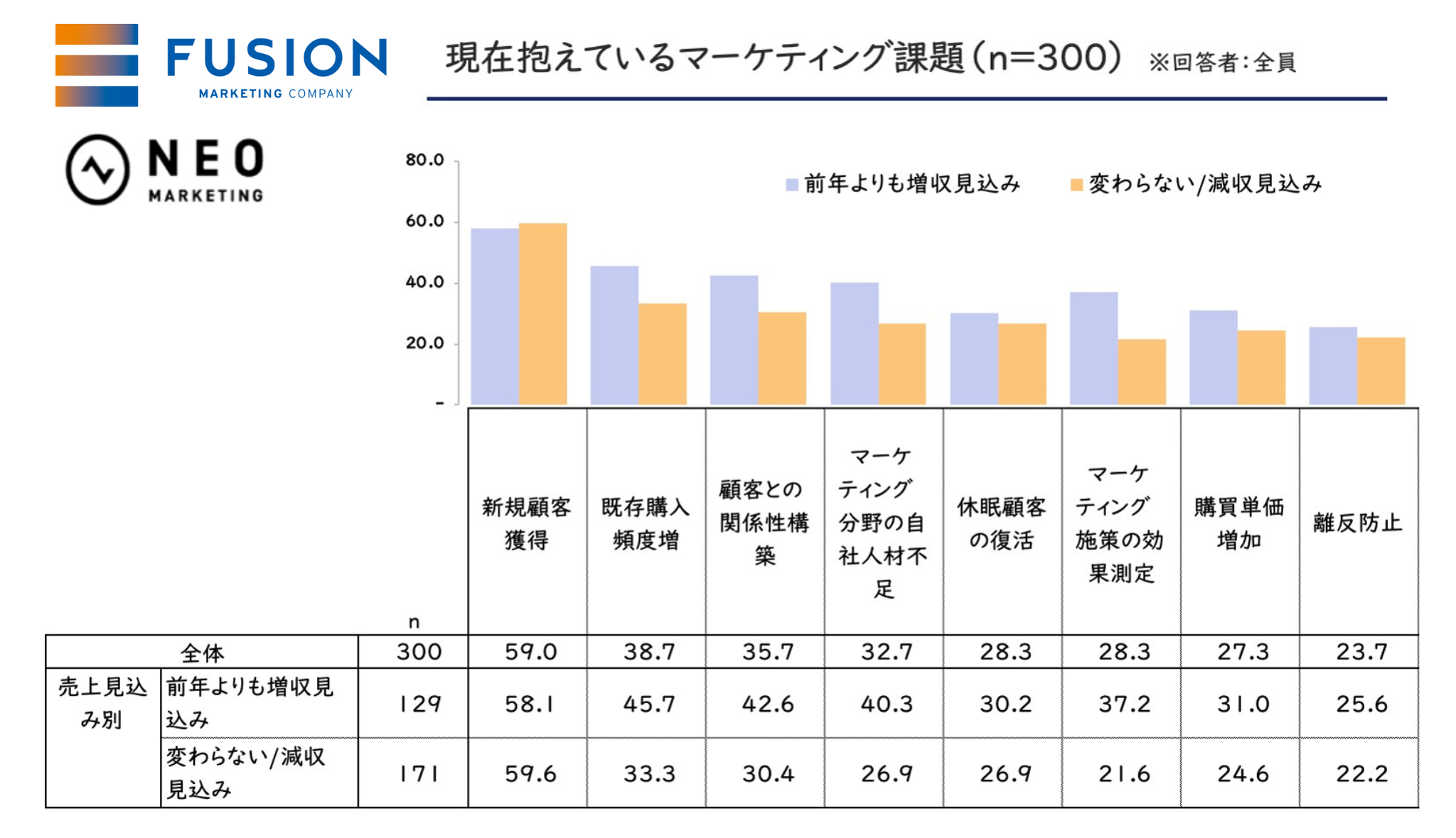 また、増収企業は40%以上、横ばい/減収企業は30%以上が「既存購入頻度増」「顧客との関係性構築」に課題感を抱いていることがわかります。