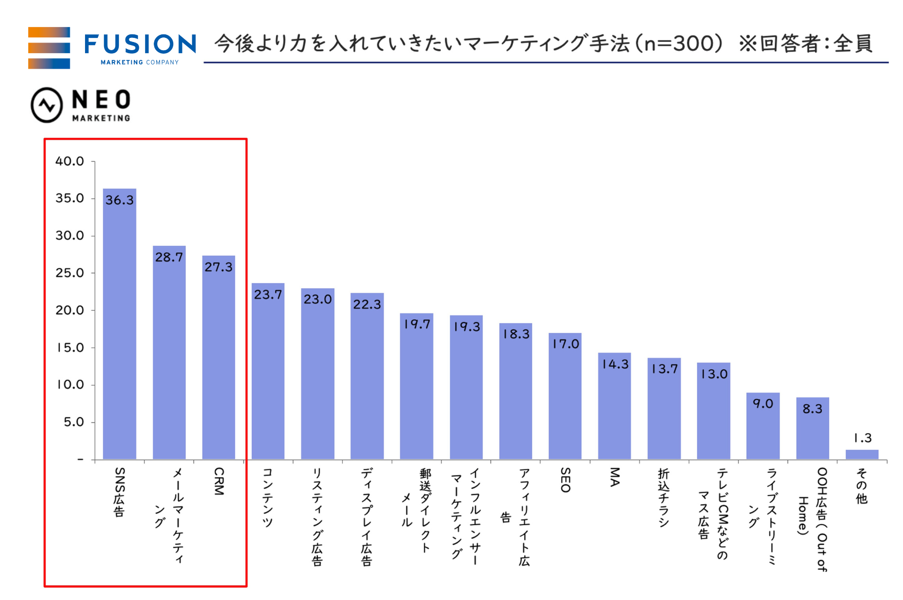 トップが「SNS広告」で36.3%、そこに「メールマーケティング」「CRM」が30%弱で続きました。