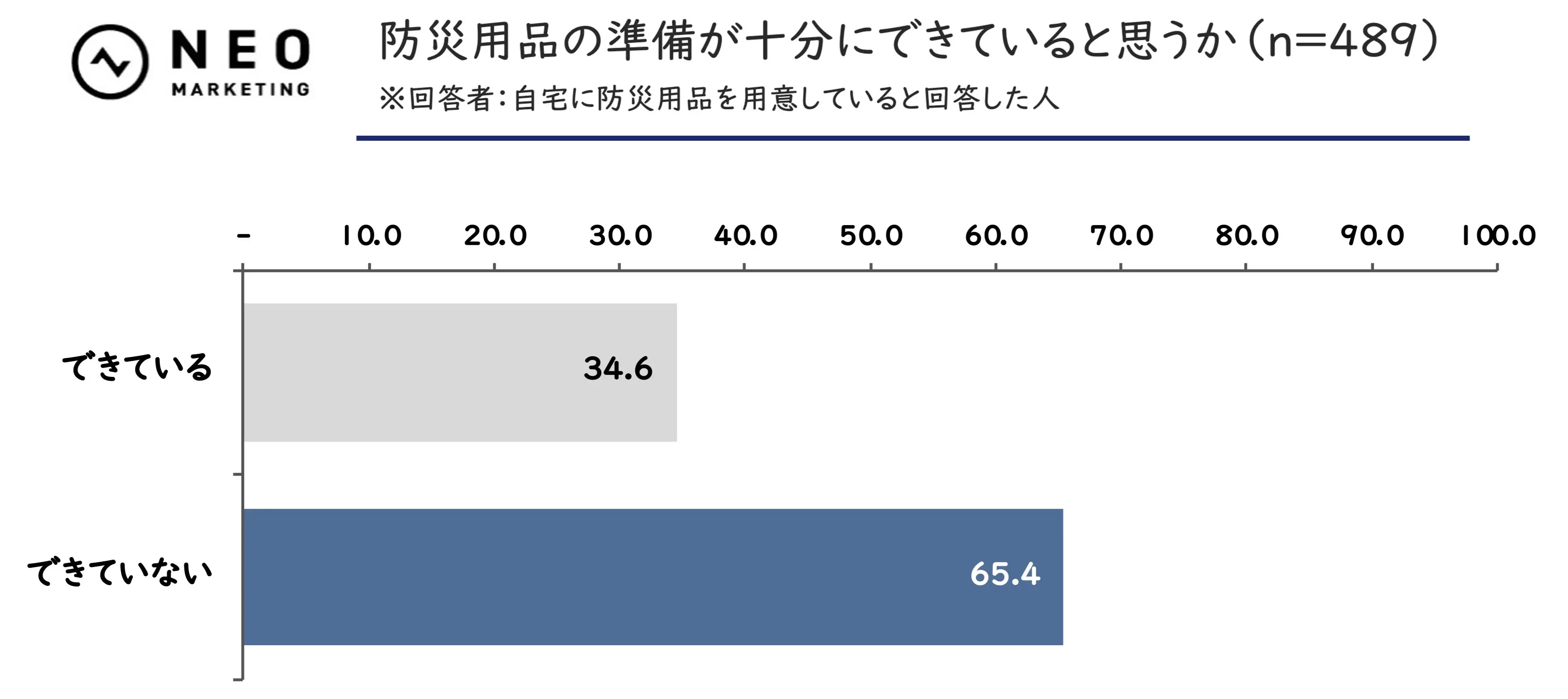 自宅に防災用品を用意している人でも、約65.4%が準備不足と感じている。
