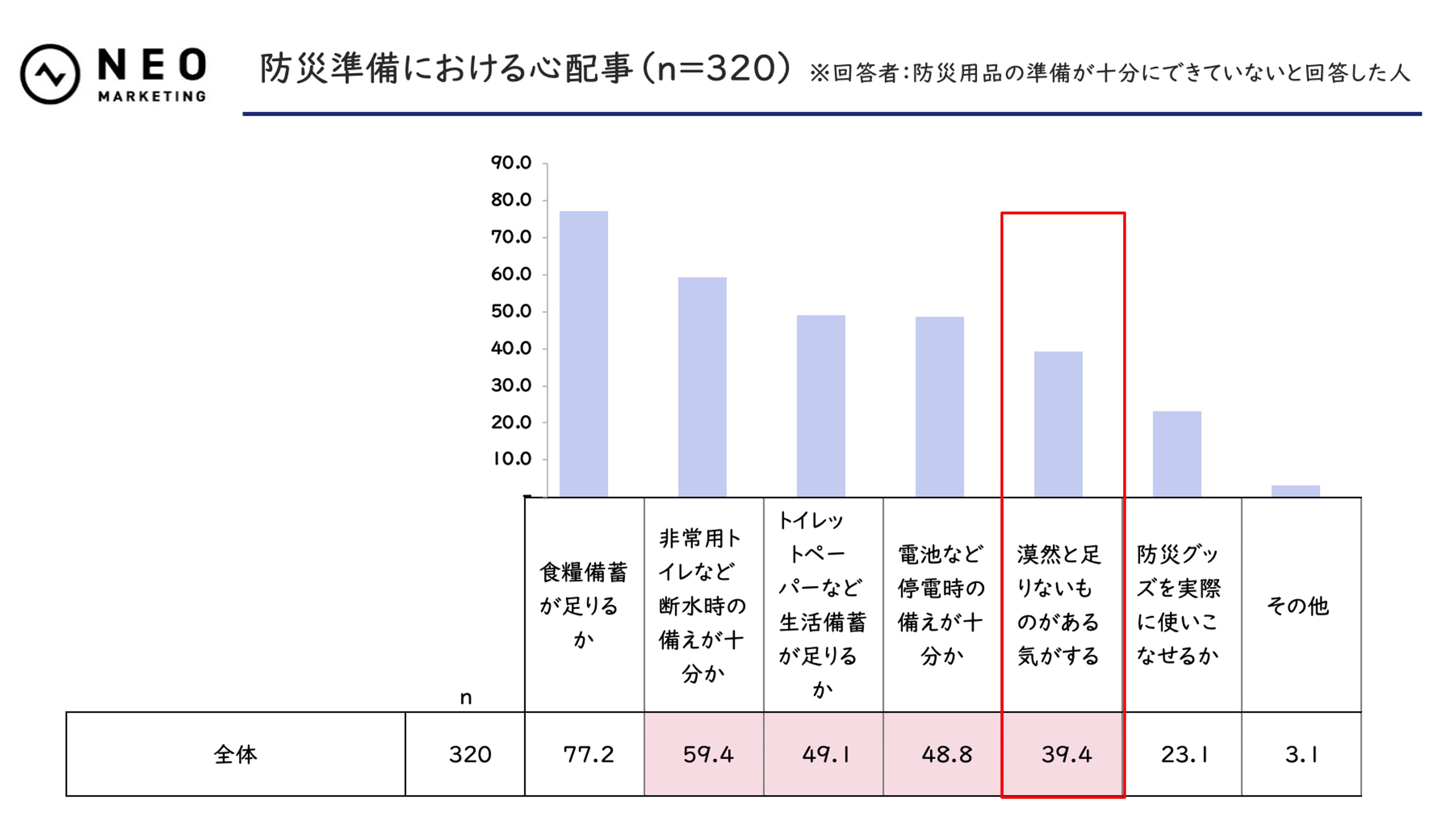 防災用品を用意しているが、準備が十分に「できていない」と回答した人のうち、心配事とし「食糧備蓄が足りるか」がトップで77.2%でした。