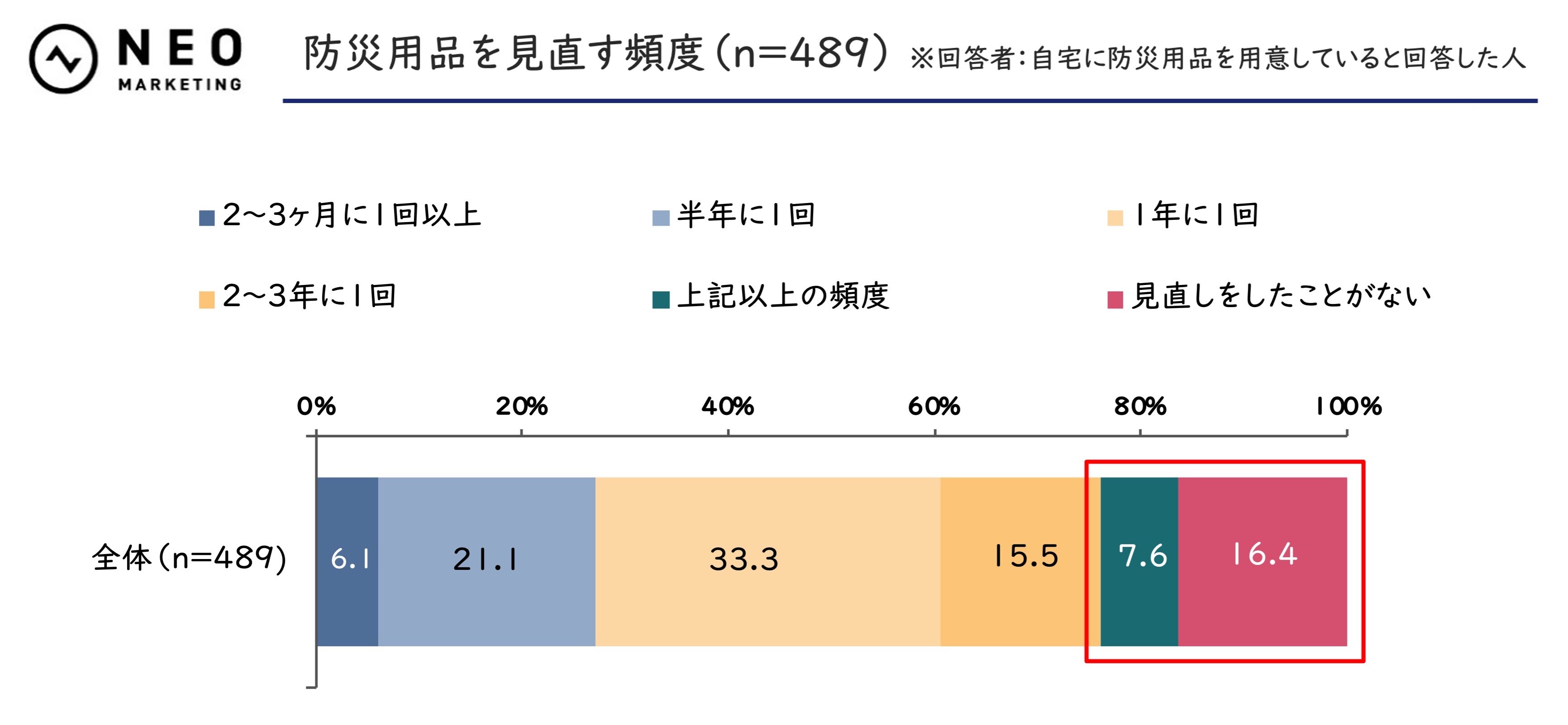 3年以上の頻度や、見直しをしたことがないという、防災用品の“買いっぱなし”層が約20%いる一方、約60%が最低でも1年に1回は見直しをしているという結果となりました。