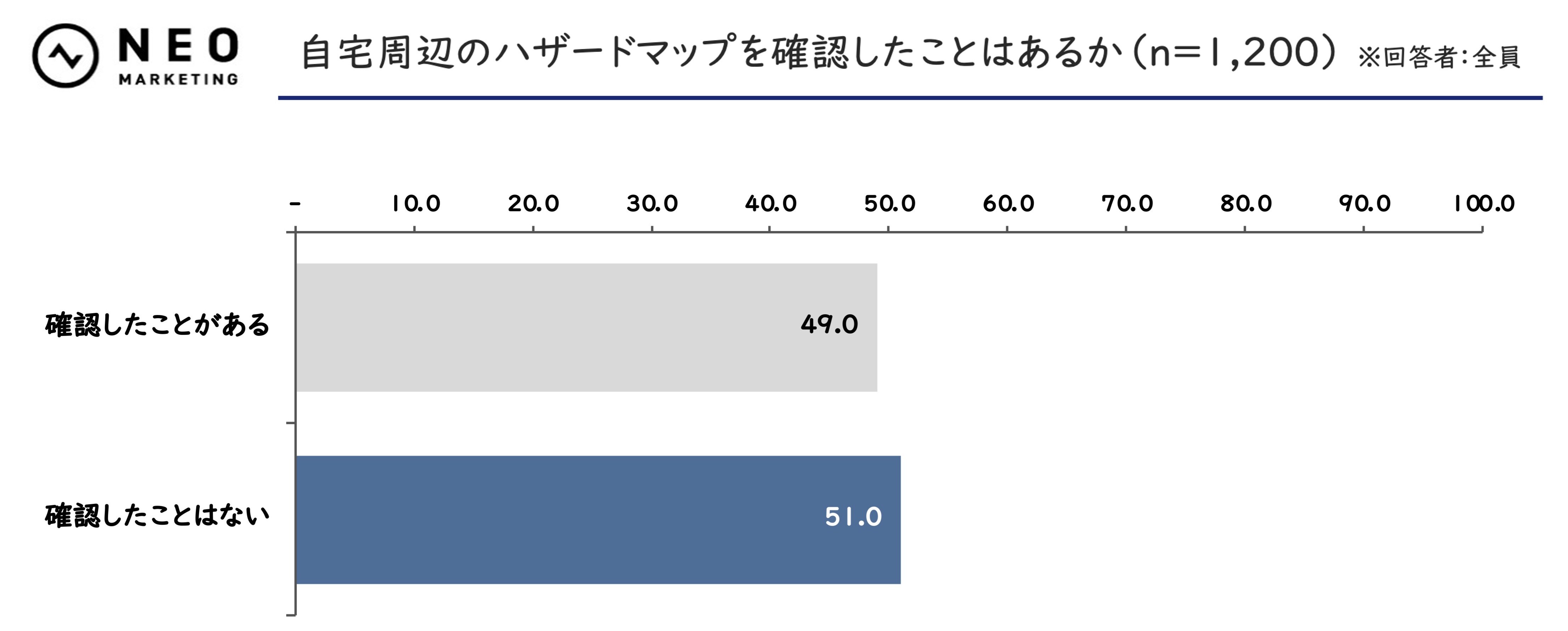 前掲した設問【自宅周辺のハザードマップを確認したことはあるか】では「確認したことはない」と回答した割合が半数以上でしたが、ハザードマップまでは確認したことが無くとも、災害時に自分がどこに避難するのかは基本知識として把握している人が多いことが分かりました。