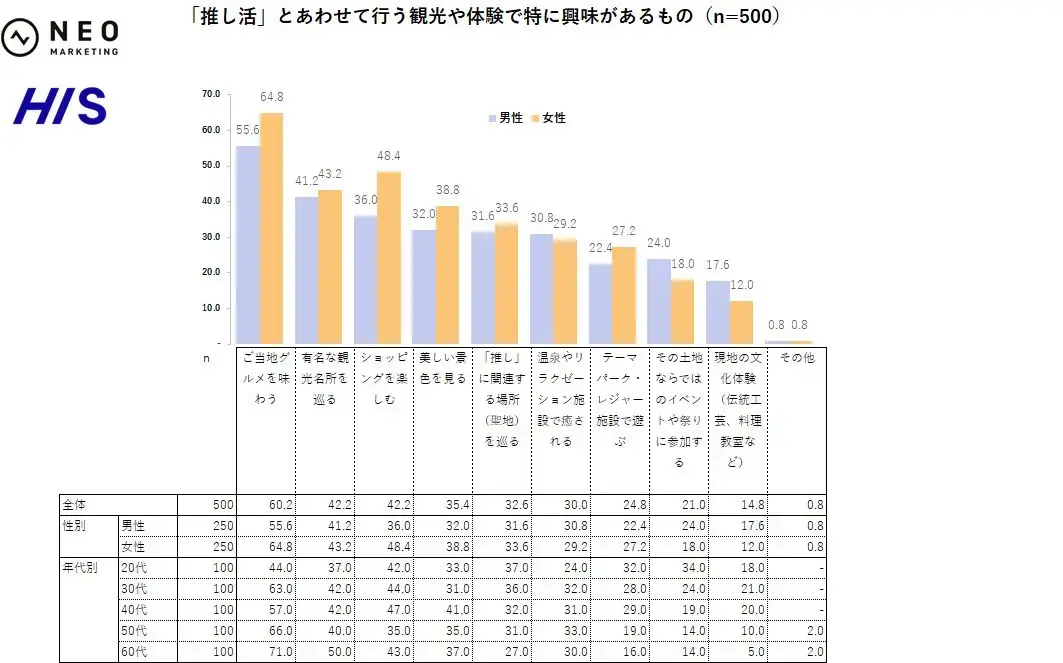 推し活遠征に合わせる観光・体験は「ご当地グルメを味わう」が最多(60.2%)で男女ともに食が牽引。