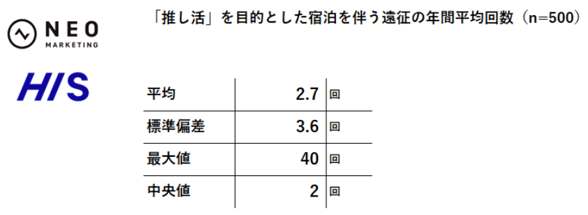 「推し活」を目的とした宿泊を伴う遠征の年間平均2.7回で、“年2〜3回”がボリュームゾーン。一方で最大40回という超ヘビー層も。
