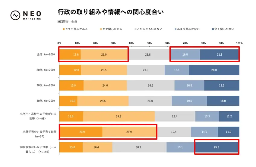 はじめに、現在住んでいる地域の行政(都道府県や市区町村)の取り組みや情報に対する関心度合いをお聞きしました。