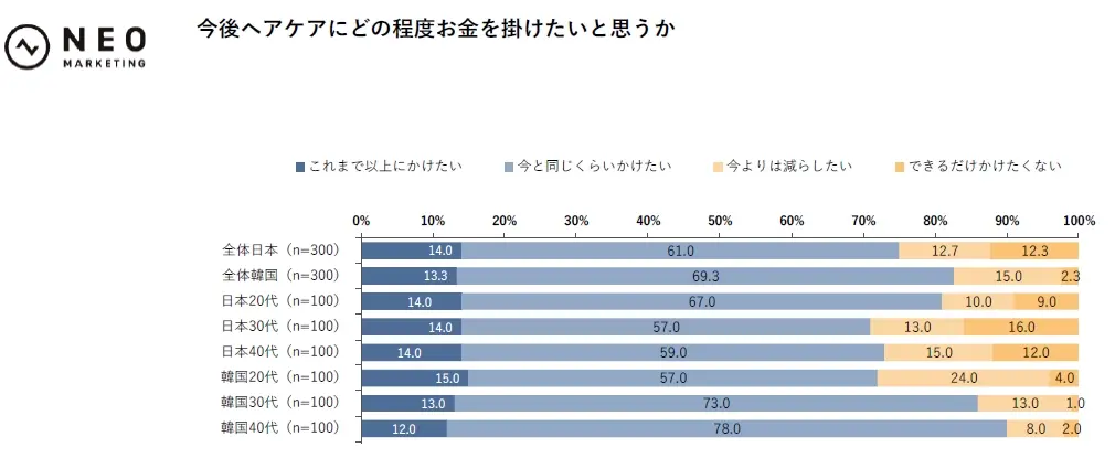 ヘアケアに対する月間支出額の平均は、日本で約4,100円、韓国で約8,800円と、非常に大きな差があった。今後の支出の増減予定については、両国で共通して7~8割が「現状維持」または「これまで以上にかけたい」と回答しており、支出額に違いはあるものの、毎月安定的な支出が行われていることがうかがえた。
