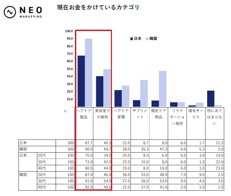 日本も韓国も「ヘアケア製品」「美容室での施術」が高い。韓国は全体的にお金をかけており、「サプリメント」「頭皮ケア用品」の需要も高い。