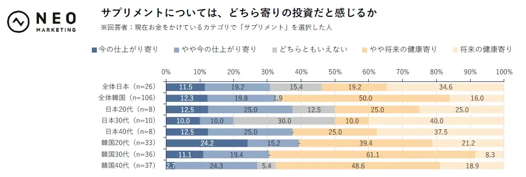 今後どのような投資をしていきたいか聞いたところ、日本では「即効性のあるもの」と回答した人が52%だった。一方、韓国では「将来の健康に向けたもの」と63.7%が回答した。現在重視しているポイントだけでなく、将来的に重視したいポイントについても、日本は「今寄り」で韓国は「将来寄り」の傾向がみられた。