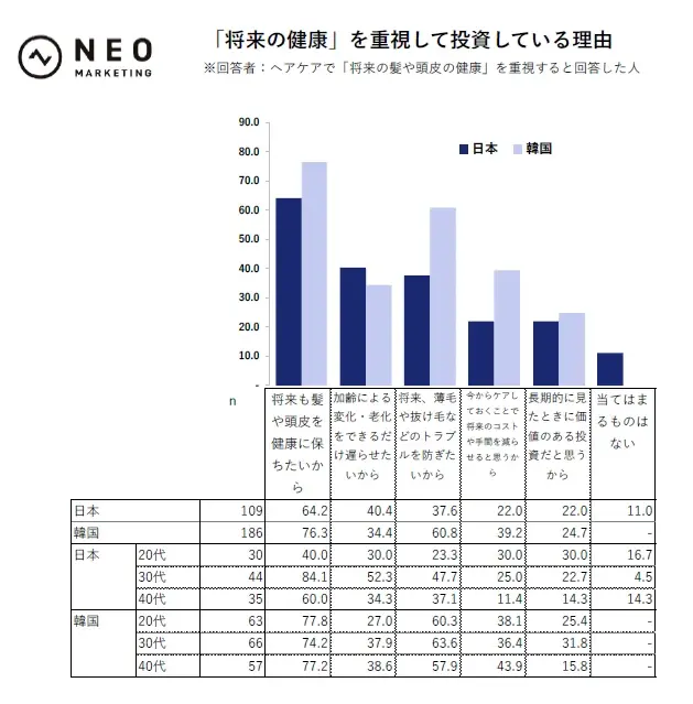 ヘアケアで「将来の髪や頭皮の健康」を重視すると回答した人に、その理由を聞きました。最も多かったのは「将来も髪や頭皮を健康に保ちたいから」で、日本は64.2%、韓国は76.3%でした。日本と韓国を比較すると、「将来、薄毛や抜け毛などのトラブルを防ぎたいから」「今からケアしておくことで将来のコストや手間を減らせると思うから」は、韓国が日本よりも非常に高い傾向がありました。