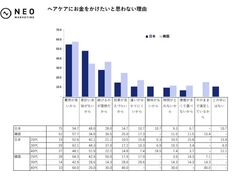 ヘアケアにお金をかけたいと思わない理由は、日本と韓国に共通して「費用が高いから」「家計に余裕がないから」が回答率の上位を占めました。