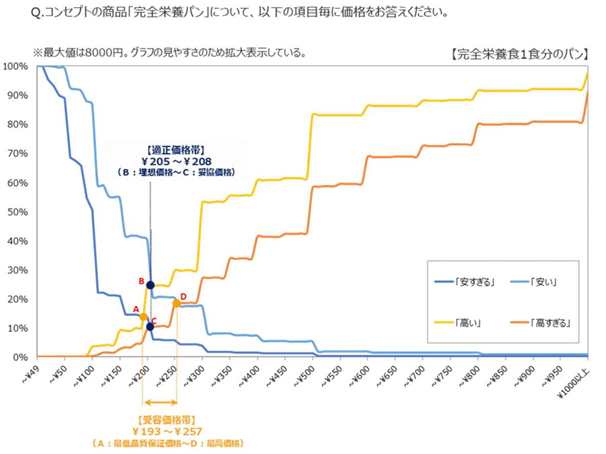 仮想の商品「完全栄養パン」を説明した同一のコンセプト案を呈示し、CVM分析、PSM分析、一般的な価格受容性をはかる手法を用いて結果を比較分析しました。