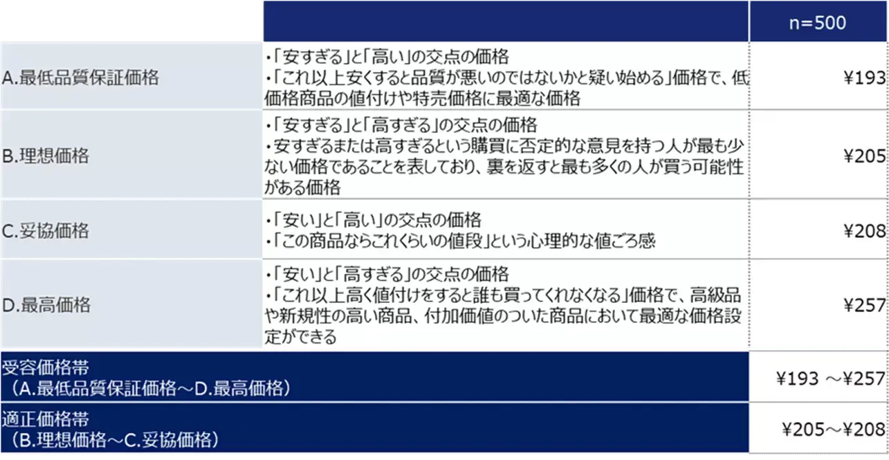 新規商材など消費者が価格帯をイメージしづらい商材にも適しています。もちろん、価格イメージのある商材でも分析は行えます。
