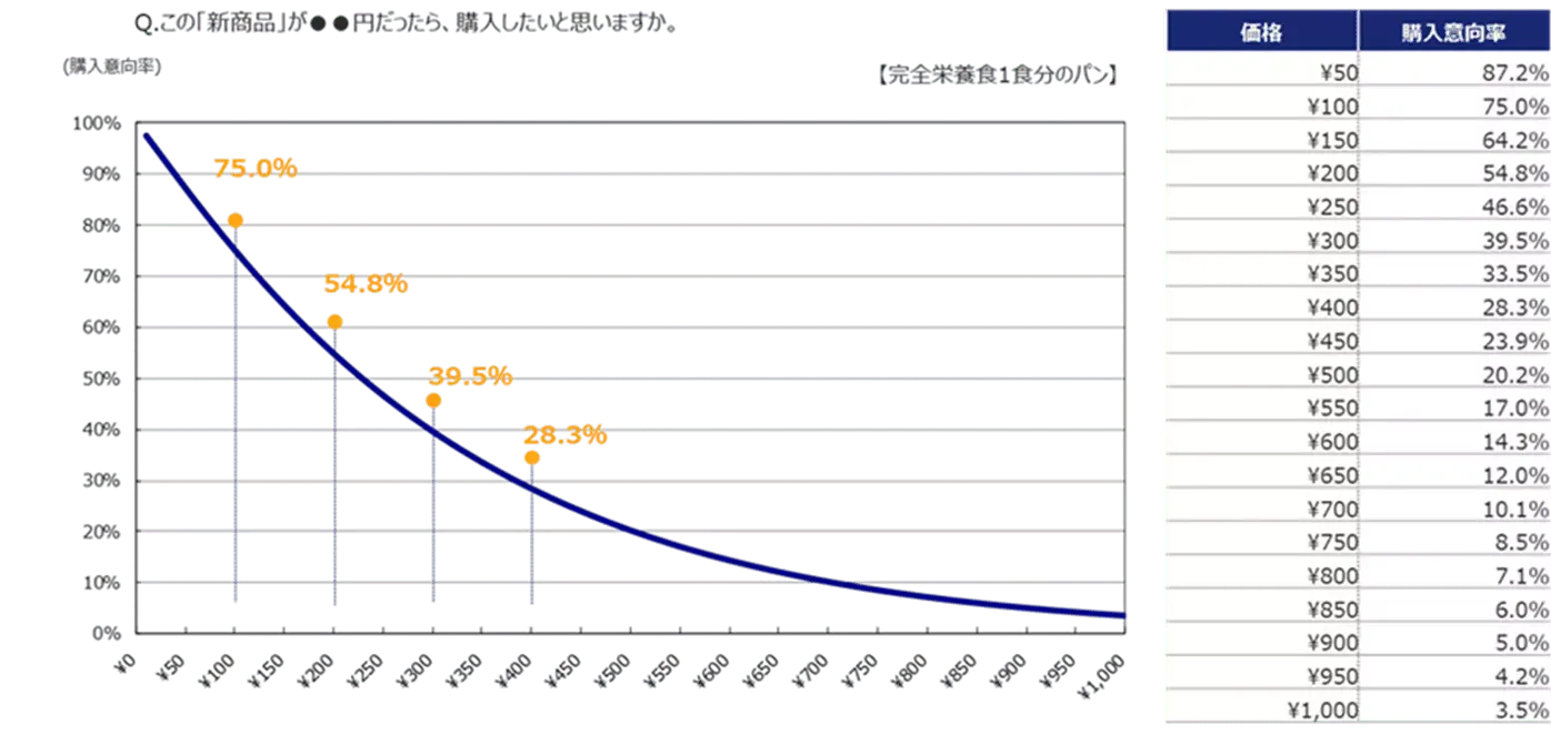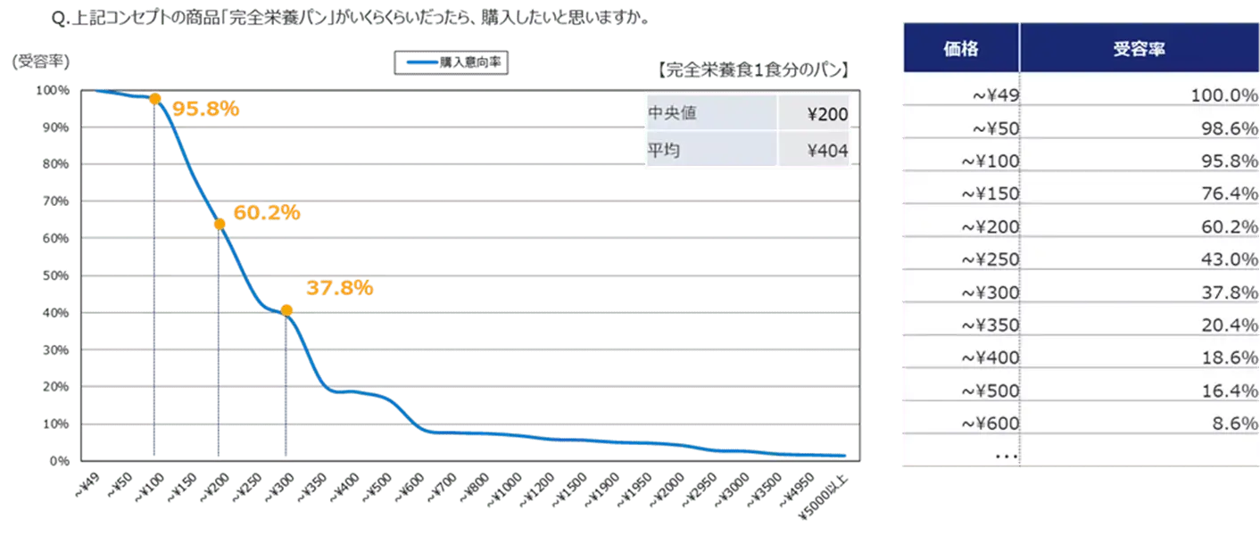 ・“200円は54.8%、300円は39.5%の購入意向率”といった細かな価格シミュレーションができる