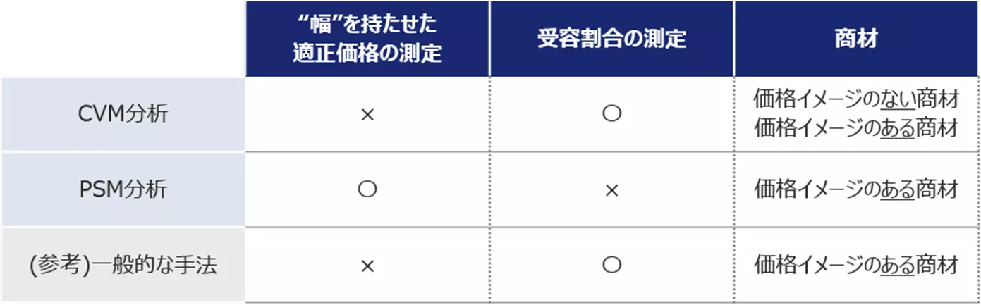 価格イメージのない商材は、イメージがないため、自由回答(FA)で入力させることに適していません。そのため、「PSM分析」「一般的な手法」に比べ、「CVM分析」の方が適しています。