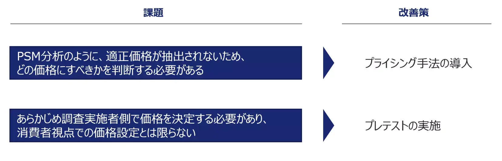 続いて、CVMの「あらかじめ調査実施者側で価格を決定する必要があり、消費者視点での価格設定とは限らない」という課題に対して、「プレテストの実施」という改善策が考えられます。