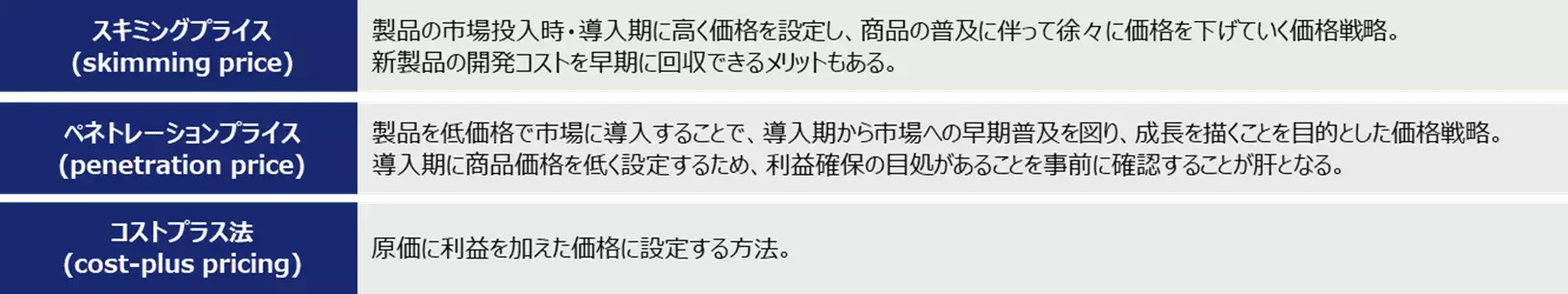 CVM分析の「PSM分析のように『適正価格』が結果としてそのまま表れないため、どの価格にすべきかを判断する必要がある」という課題に対して、代表的なプライシング(価格設定)の考え方が活用できます。