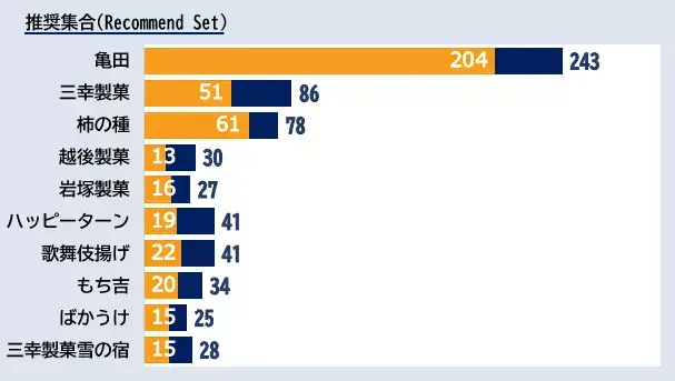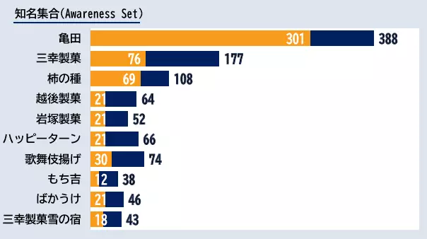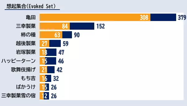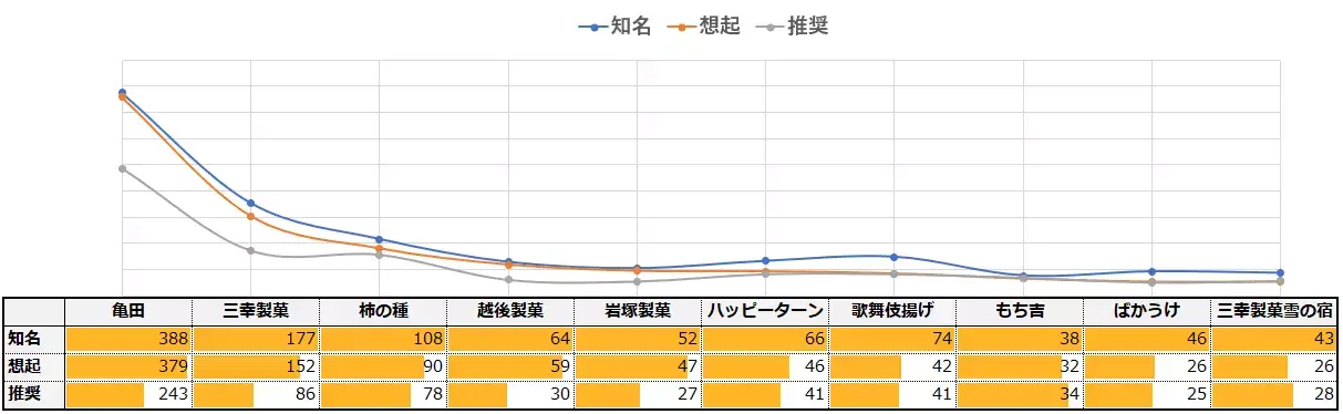 「知名/想起/推奨集合」のいずれのグラフも「亀田」(亀田製菓社)がトップ、次点で「三幸製菓」「柿の種」という結果になりました。また、亀田製菓社は自社商品である「ハッピーターン」もランクインしています。
