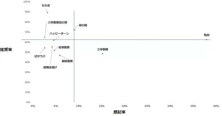 散布図に注目すると、「亀田」の想起率が非常に高いです。一方「もち吉」は、想起率は低いものの、推奨率は上位にあります。このことから、もち吉購入者の大半から支持を得ていることが伺えます。