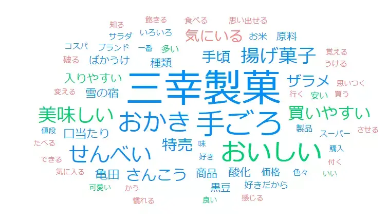 「亀田」では「慣れ親しむ」「コマーシャル」「定番」というワードの出現がみられました。