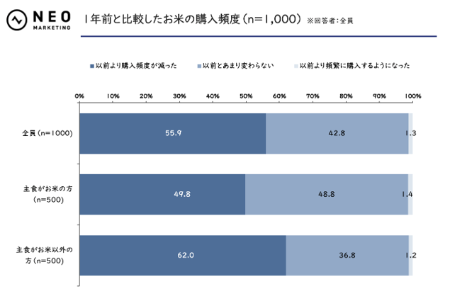 全体の55.9%が、1年前よりもお米の購入頻度が減ったと回答。