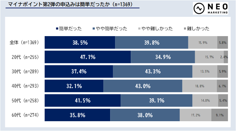 マイナポイントの申込みの難易度について聞くと、計78.3%が「簡単だった」と回答しました。60代も計73.8%が簡単だったと回答しており、年代を問わず簡単に感じる方が多いようです。マイナポイントの申込みは、ご自身の端末にマイナポイントアプリをインストールまたは手続スポットに行く等の申込開始~申込完了まで1箇所で完結するほか、マイナンバーカードと暗証番号、キャッシュレス決済サービスの「決済サービスID」と「セキュリティコード」以外の本人確認書類の準備も不要なため、簡単と感じる方が多いのかもしれません。