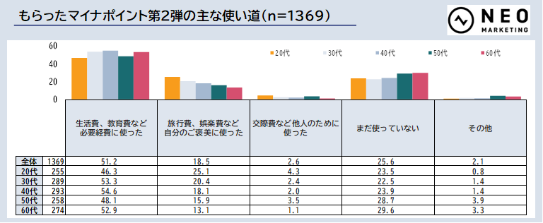マイナポイントの使い道として生活費、教育費などに使ったとの回答が約半数となりました。また、旅行費や娯楽費など自分へのご褒美に使ったという方もいらっしゃるようです。