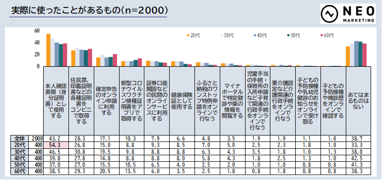 実際にマイナンバーカードを使用したシーンをお聞きすると、「本人確認書類(身分証明書)として使用する」が最も多く43.2%が回答しました。とくに、20代は54.3%と半数以上が使用したことがあると回答しています。次いで多かったのが「各種証明書のコンビニでの取得」28.3%でした。