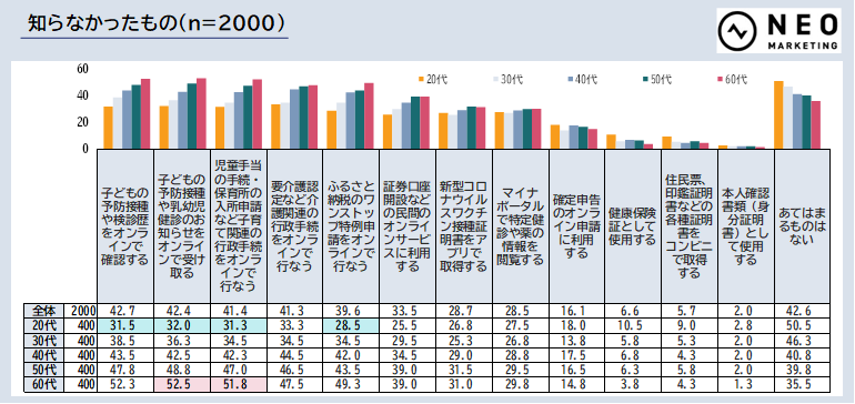 また、マイナンバーカードの活用方法として知らなかったものは「子どもの予防接種や検診歴をオンラインで確認する」、「子どもの予防接種や乳幼児健診のお知らせをオンラインで受け取る」、「児童手当の手続・保育所の入所申請など子育て関連の行政手続をオンラインで行なう」など、お子様関連の項目が上位となっています。マイナポータルの子育て関連の便利な機能は、まだ認知があまり高くないようです。