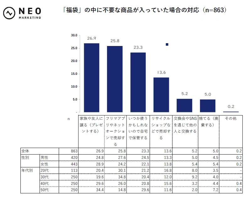 福袋の中に不要な商品が入っていた場合「家族や友人に譲る(プレゼントする)」が26.9%、「フリマアプリやネットオークションで売却」が25.8%と高い。