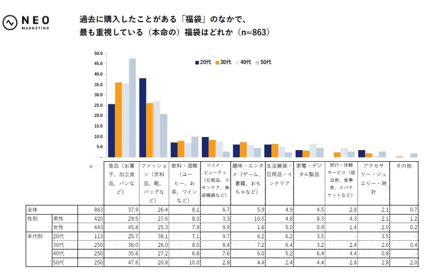 購入に至る動機やジャンルなど人気の理由、福袋の中身が見えた方が良いのか、購入方法の事前予約制の意向など実態を幅広い年代で可視化しました。