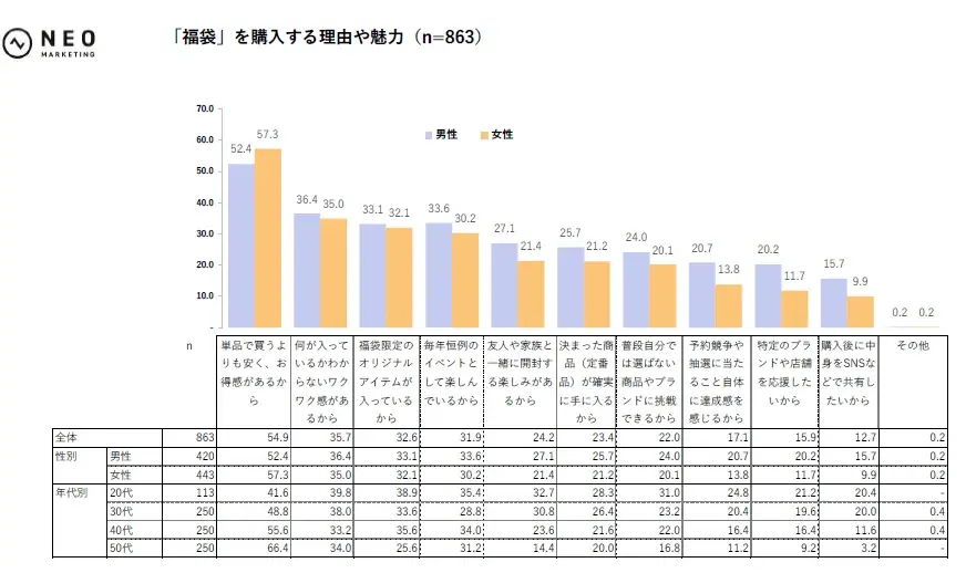 福袋を購入する理由や魅力は、「単品で買うよりも安く、お得感があるから」が54.9%で最多。年代別では、50代が66.4%で高く、年齢が上がるにつれて高くなる。