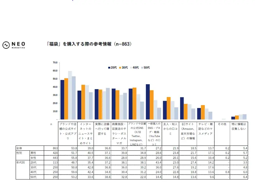 福袋を購入する際の参考情報は「公式アプリ・公式サイト」が53.8%と最多。「SNS」は20代が43.4%と高いが、年代が上がるほど下がっている。