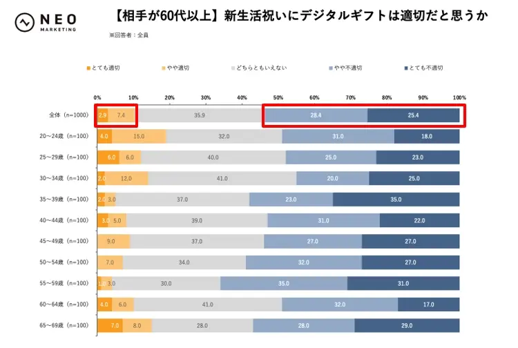 新生活祝いを贈る場合、デジタルギフトは適切だと思うかを、贈る相手の年代別でお聞きしました。