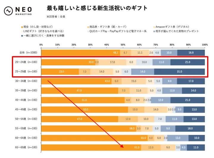 年代別で見ると、20〜24歳で「Amazonギフト券(デジタル)」19.0%、「LINEギフト」12.0%、「QUOカードPay・PayPayギフトなど電子マネー系」14.0%とデジタル系が年代別最多となり、いずれも現金10.0%を上回っていました。一方65〜69歳では現金45.0%が突出しており、年代が上がるほど現金、下がるほどデジタルギフトに寄る傾向が見られます。
