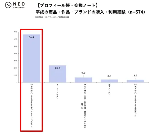 当時の購入・利用経験(【子供時代】自分用として買ってもらった/買った)が特に強かったのは、「プロフィール帳・交換ノート」66.4%と「シール交換・シール帳」49.8%。平成女児カルチャーの中でも、日常的に手元で使い、友人同士のやり取りの中に自然に入り込んでいたものほど、購入・利用経験の広がりが大きかったことがわかりました。
