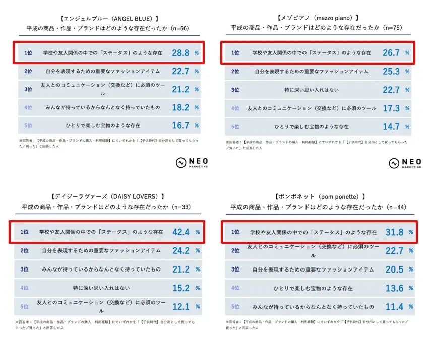 ファッションブランド群では「学校や友人関係の中での『ステータス』のような存在」が上位に入りやすく、デイジーラヴァーズ42.4%、ポンポネット31.8%、エンジェルブルー28.8%、メゾピアノ26.7%と、持っていること自体に価値を感じる側面が強かったことがわかる。平成女児カルチャーの中でも、ファッションは“好き”だけでなく“憧れ”や“背伸び”を可視化する役割を担っていたようだ。