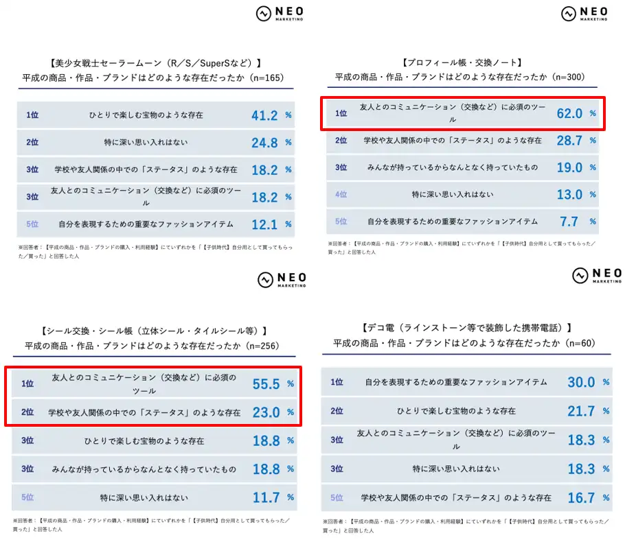 一方で、プロフィール帳・交換ノート62.0%、シール交換・シール帳55.5%は「友人とのコミュニケーション(交換など)に必須のツール」が最多で、こちらはステータスというより、日常の人間関係の中で機能する存在でした。ただし、シール交換・シール帳では「学校や友人関係の中での『ステータス』」も23.0%と一定程度あり、遊び道具でありながら“何を持っているか”が友人関係の中で意味を持っていたこともうかがえます。