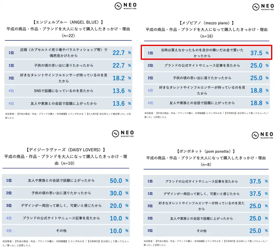 また、「【大人時代】子供(自分の娘・親戚など)のために買った」割合も、ポンポネット17.1%、デイジーラヴァーズ16.3%、メゾピアノ12.7%などファッションブランド群で比較的高く、次世代へ受け継がれやすい点も印象的でした。