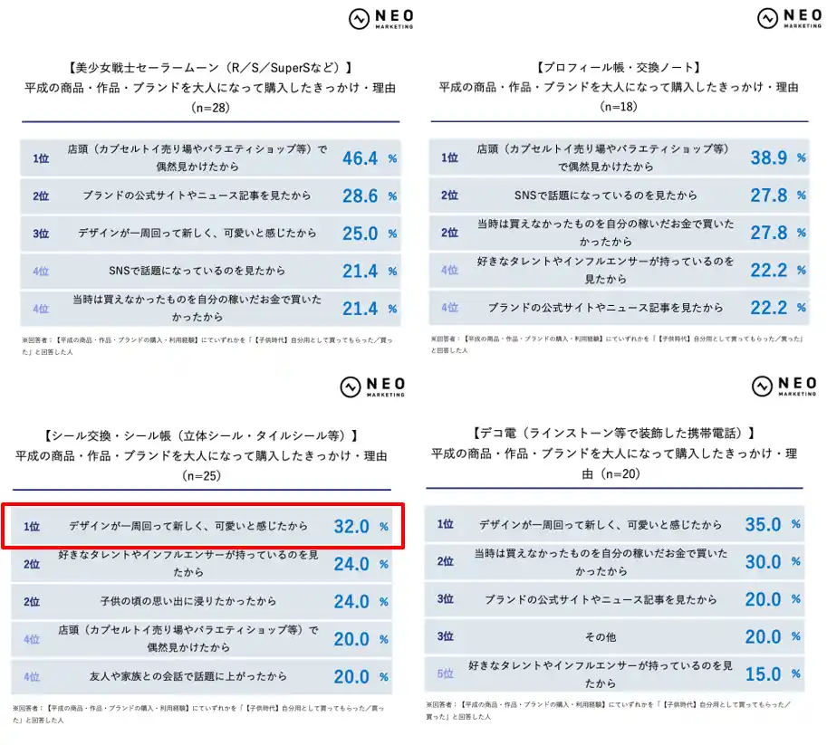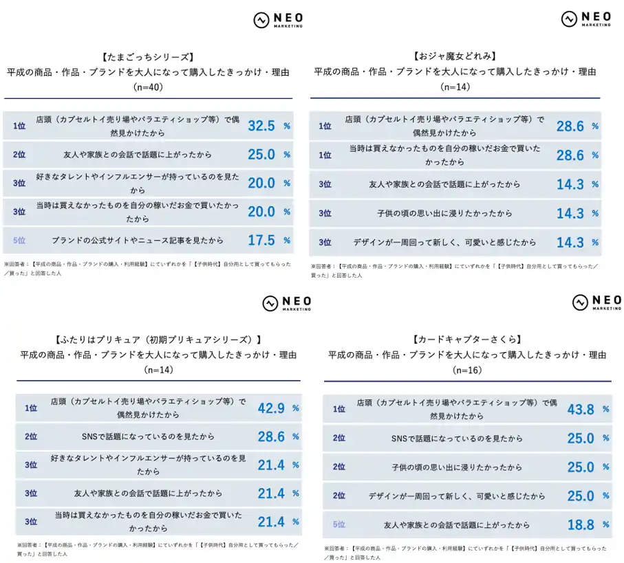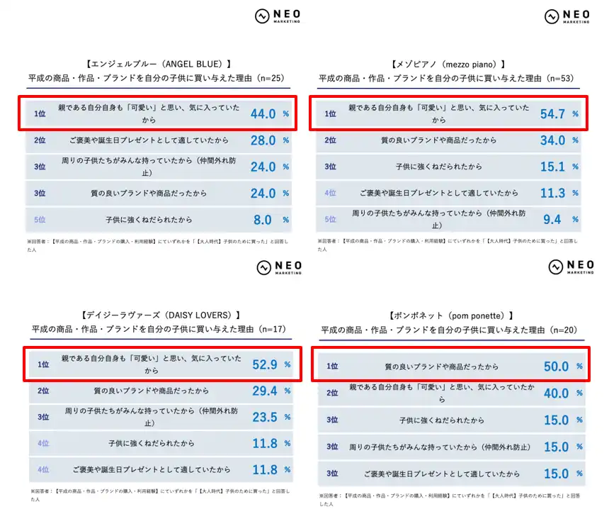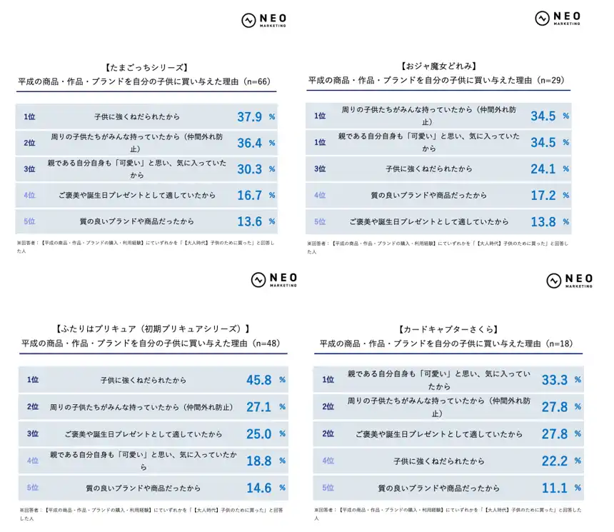 ほぼ全体を通じて「親である自分自身も『可愛い』と思い、気に入っていたから」がTOP3に入っており、購入動機のベースには、親自身の平成コンテンツに対する前向きな感情があることがわかります。