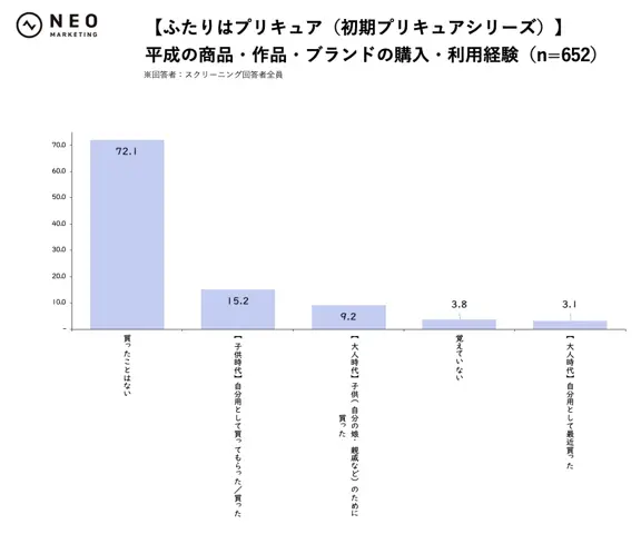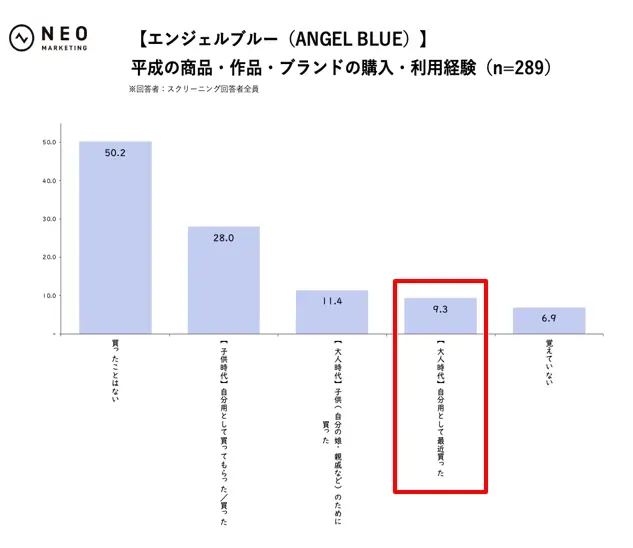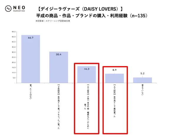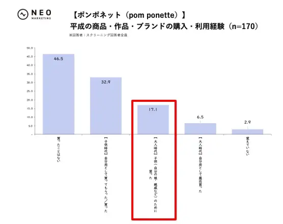 一方でファッションブランド群は、子供時代の購入・利用経験率こそポンポネット32.9%、デイジーラヴァーズ30.4%、エンジェルブルー28.0%と一定水準あるものの、大人時代に自分用として最近買った割合が比較的高めなのが特徴です。