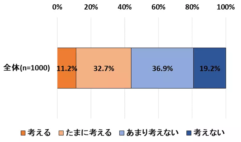 商品・サービスの購入を検討する時、それがどのようにして作られたかといった背景を考えるかお聞きしました。「考える」「たまに考える」と回答した方は43.9%で、4割以上となりました。商品やサービスそれ自体だけでなく、そのバックグラウンドまで意識して購入する方は少なくないようです。