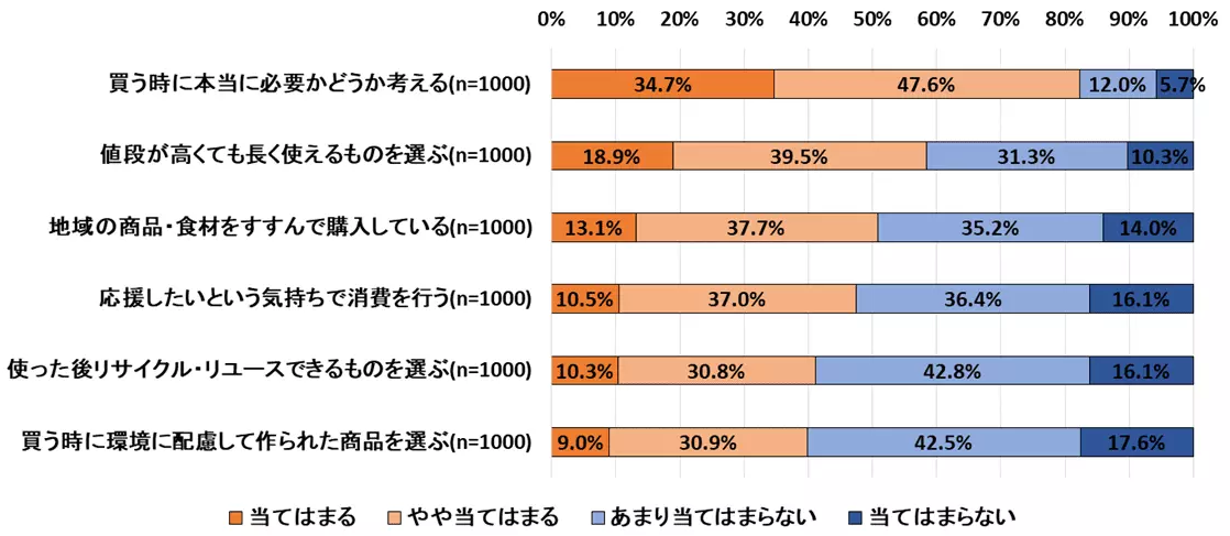 「当てはまる」「やや当てはまる」と回答した方が最も多かった選び方としては、「買う時に本当に必要かどうか考える」が82.3%で、8割以上という結果でした。これに次いで回答者が多かったのは「値段が高くても長く使えるものを選ぶ」で、58.4%となりました。