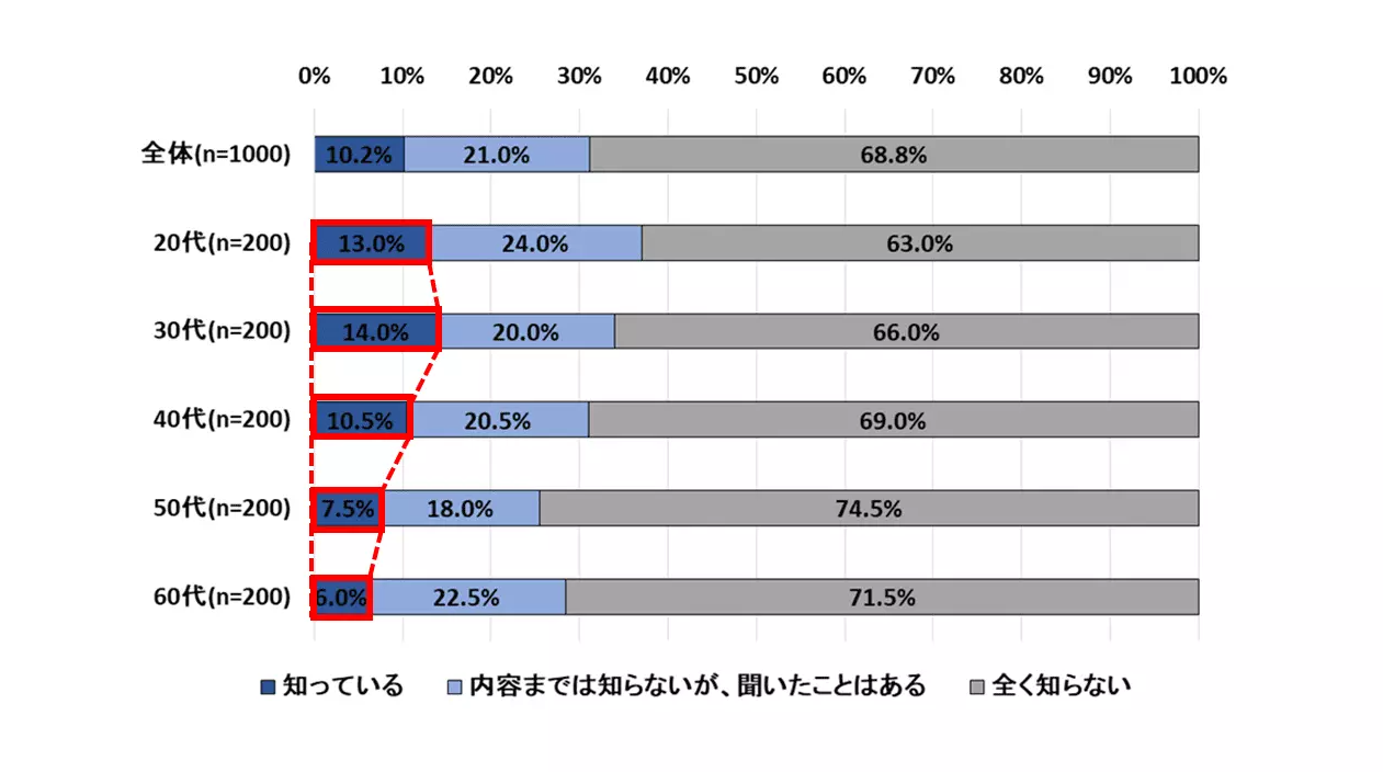 「エシカル消費」を知っているかについてお聞きしました。全体で「知っている」「内容までは知らないが、聞いたことはある」と回答した方は31.2%にとどまりました。また、年代別にみると、「知っている」と回答した方は30代以降、年代が上がるにつれてやや低下しているのが分かります。