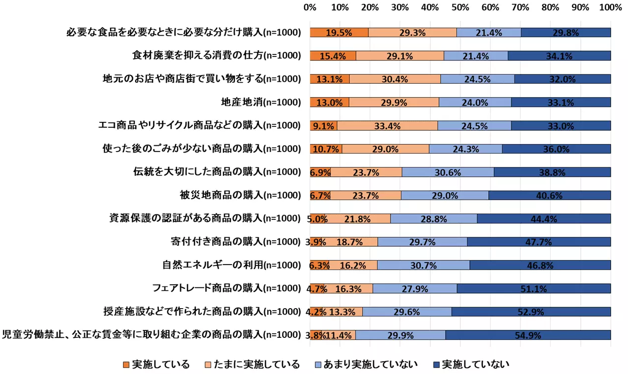 「エシカル消費」について実施していることをお聞きしました。「実施している」「たまに実施している」と回答した中で、「必要な食品を必要なときに必要な分だけ購入」が48.8%、「食材廃棄を抑える消費の仕方」が44.5%と高く、次いで「地元のお店や商店街で買い物をする」「地産地消」、さらに「エコ商品やリサイクル商品などの購入」「使った後のごみが少ない商品の購入」が続く結果となりました。