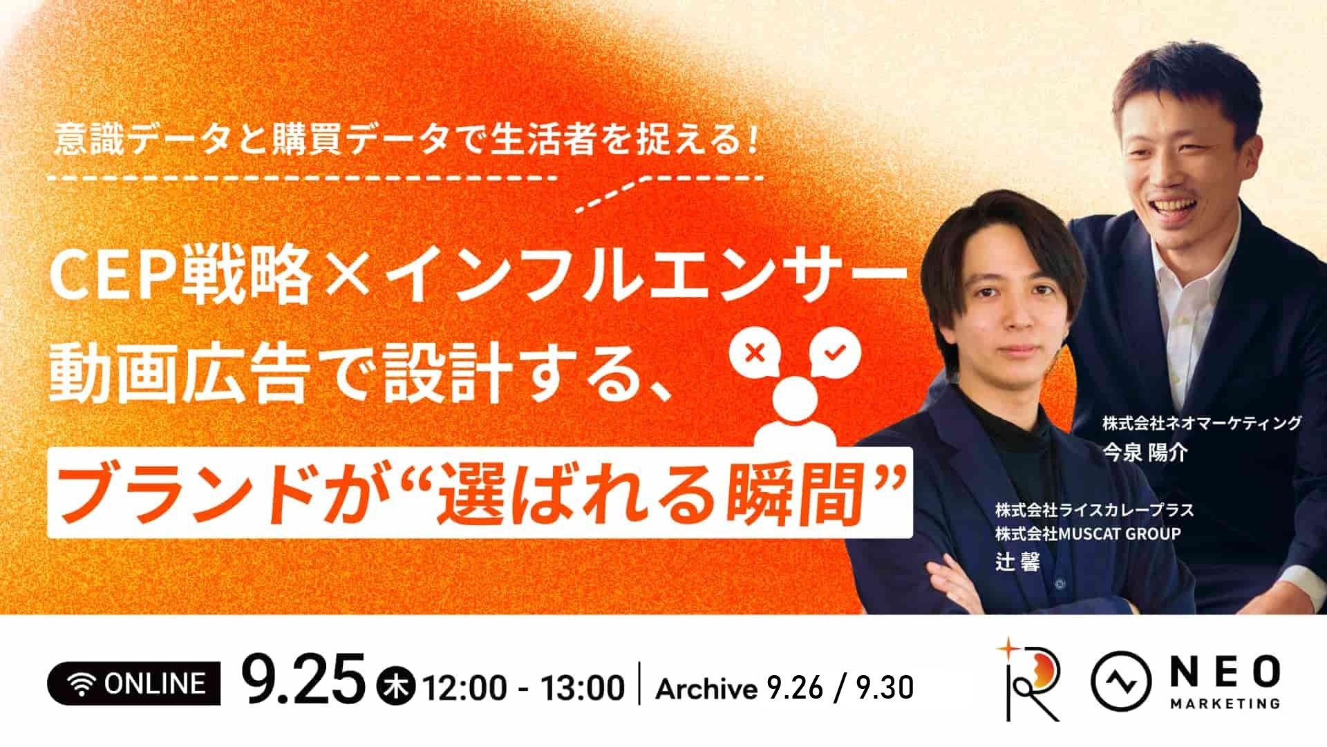 意識データと購買データで生活者を捉える!CEP戦略×インフルエンサー動画広告で設計する、ブランドが"選ばれる瞬間"共催開催日時|2025年9月25日(木)12:00 ‐ 13:00 アーカイブ配信日時|2025年9月26日(金)11:00 ‐ 12:00、30日(火)12:00 ‐ 13:00 参加料 |無料 視聴方...