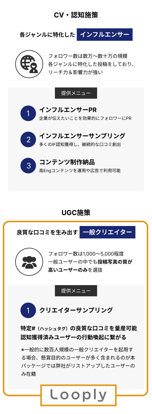 商材によってターゲットとしたい性別・年齢・興味に影響が大きいクリエイターを選択することにより、共感の得られやすいUGCが自然と形成されます。